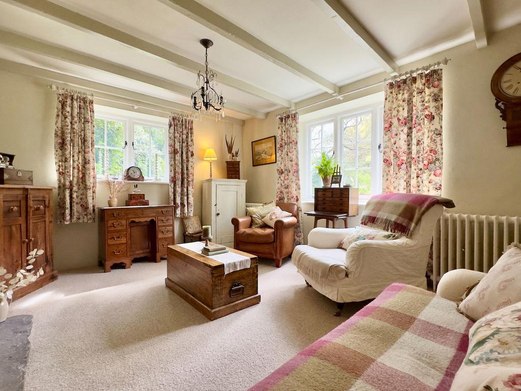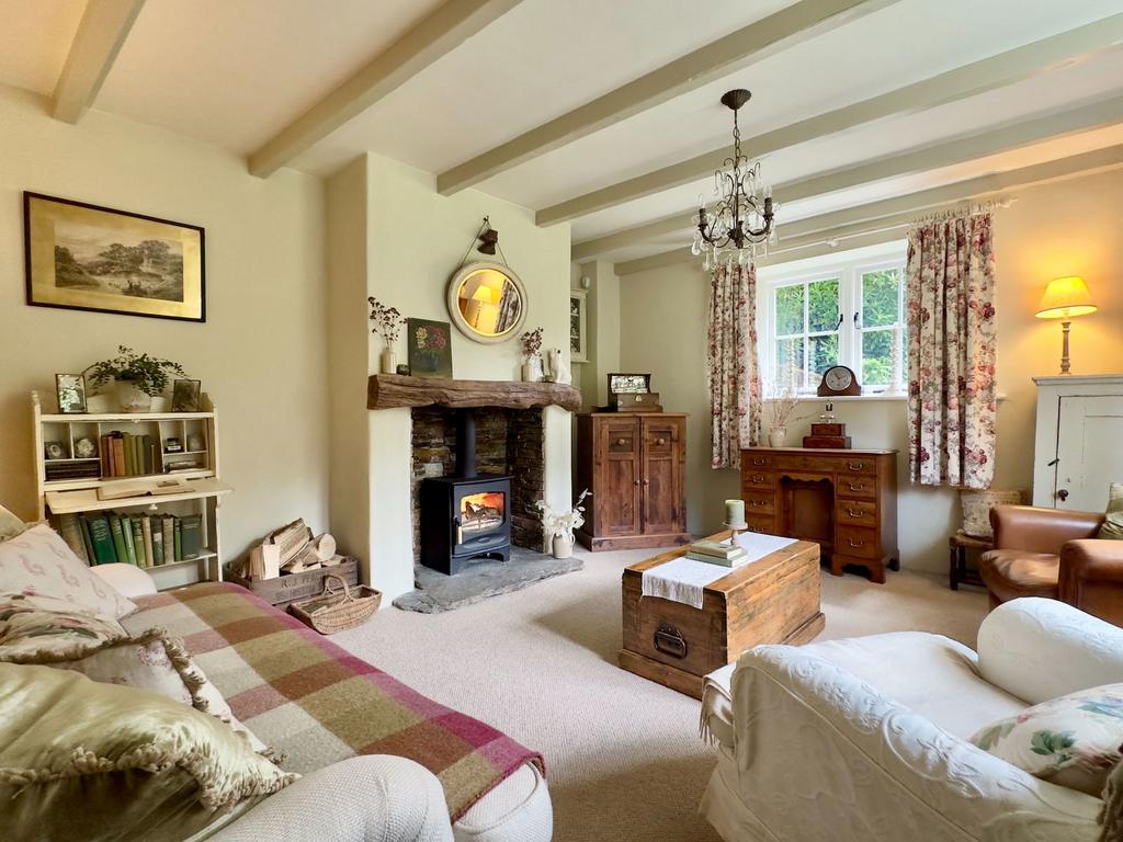 Light dual aspect room with double glazed windows to front and side. Feature woodburning stove set in revealed stone fireplace with slate hearth and timber overmantel. 2 vintage radiators. Beamed ceiling.