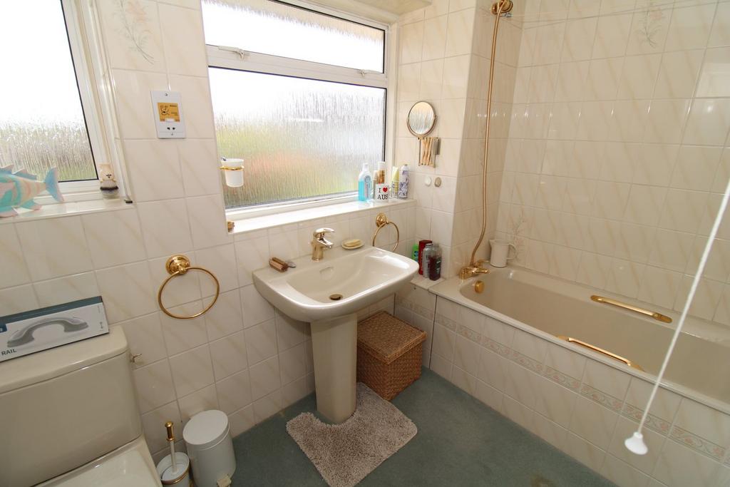 2.71m x 2.48m reducing to 1.46m (4' 9") (8' 11" x 8' 2") Two double glazed rear windows, Champagne coloured low level w.c. and pedestal wash basin, bath with a mixer tap/hand shower, tiled shower with a door and Force 10 shower, tiled walls, white upright ladder style radiator, shaver point, ceiling downlights