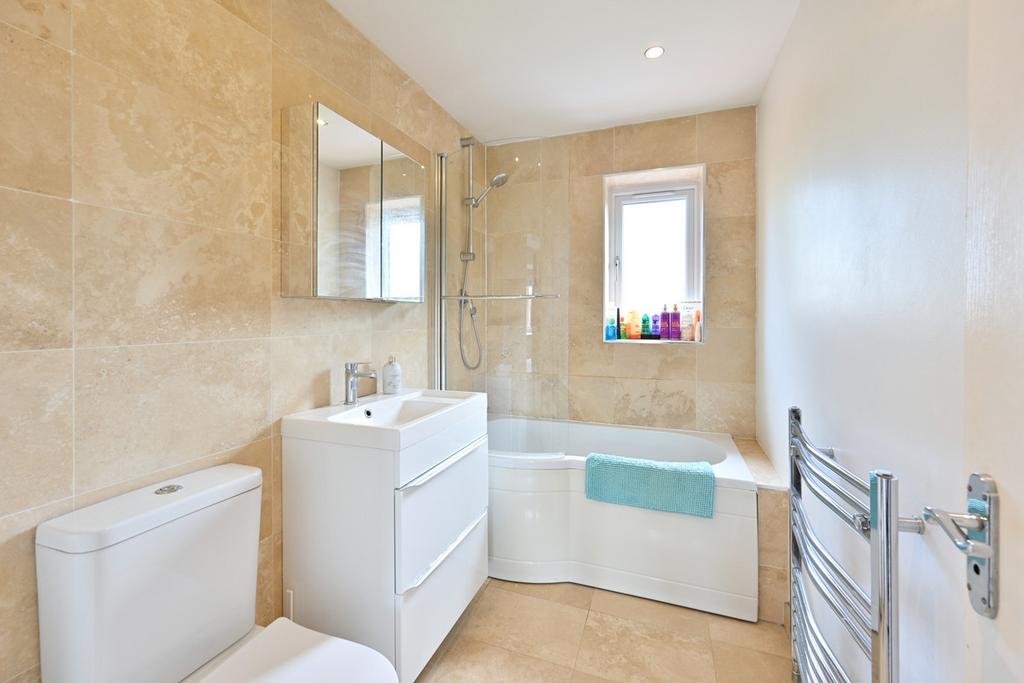 UPVC double-glazed frosted glass window, painted ceiling with spotlights, ceramic wall tiles / painted walls, ceramic floor tiles, white bath with stainless steel shower, modern chrome radiator / towel rail, sink with vanity unit, mirrored wall-cabinet, extractor fan, shaving point.