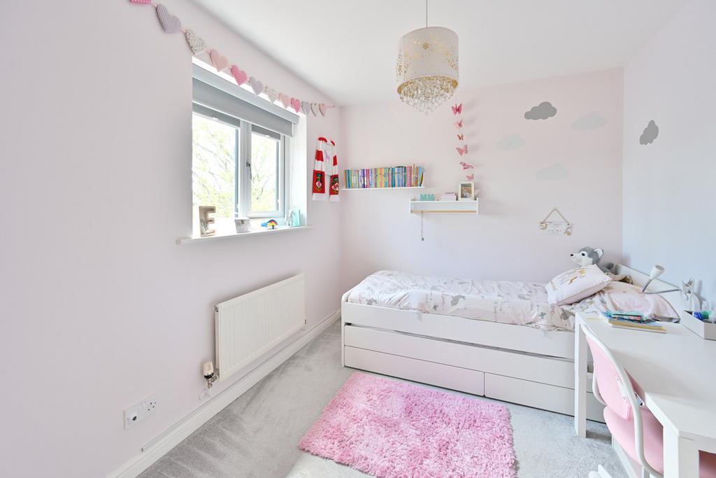 UPVC double-glazed window with blackout blind and grey roller-blind, painted ceiling with hanging light-fitting, light pink / grey feature wall with cloud pattern, carpeted floor, radiator.