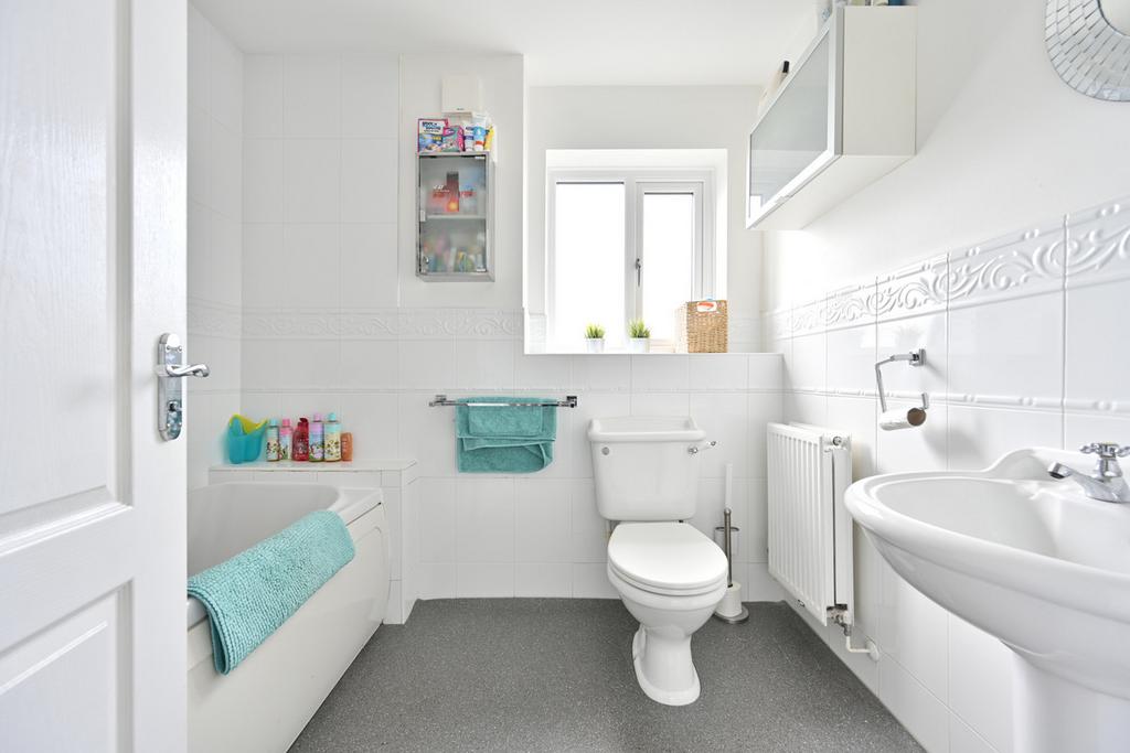 UPVC double-glazed frosted glass window, painted ceiling with spotlights, white wall tiles, grey laminate flooring, white porcelain Twyford toilet and sink, bath with shower, 2 x wall cabinets, glass shelving, double radiator.