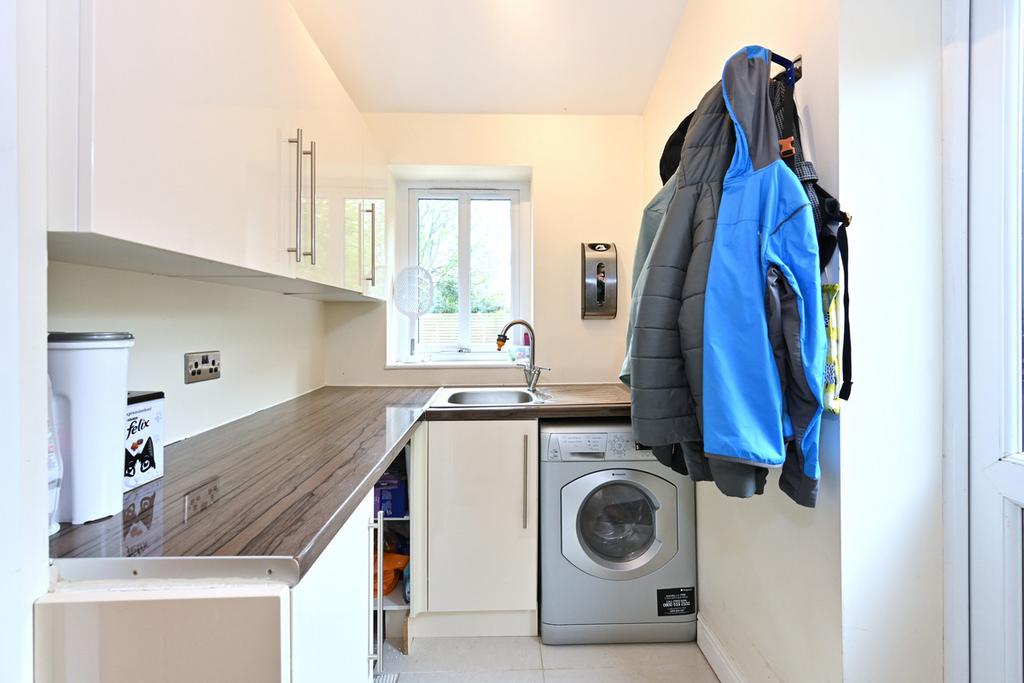 Parking for 2 cars, loft access and fitted tool cupboards, lighting and power sockets.