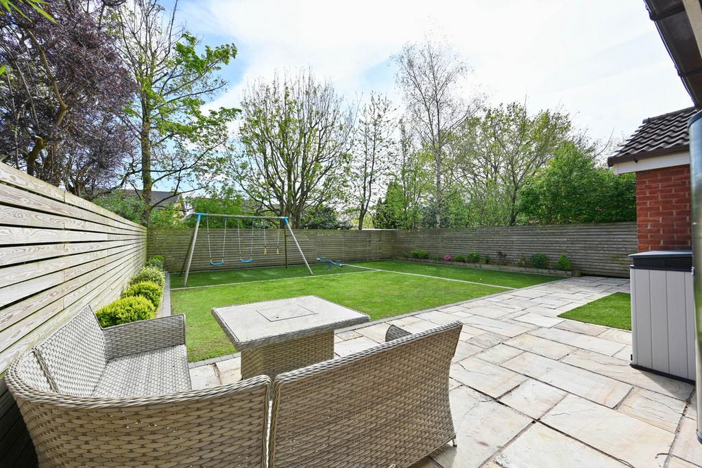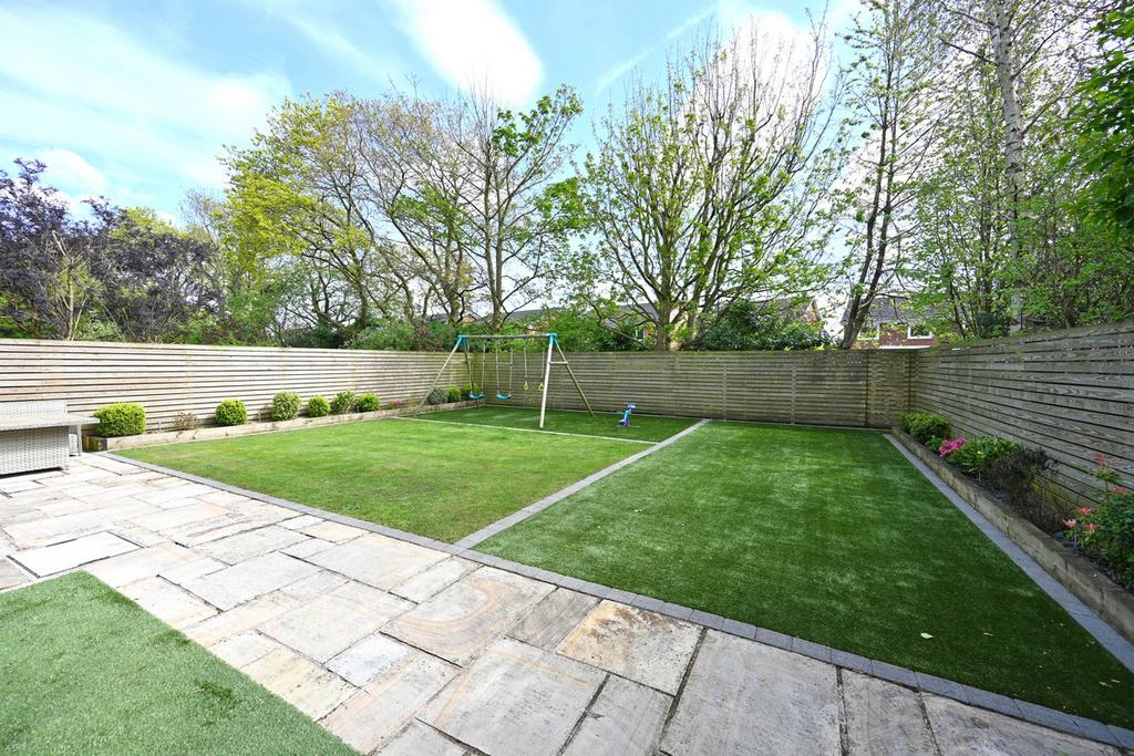 South facing garden, central lawn area with 2 additional astroturf areas, large stone patio area, security lighting, shrubs to side and trees at the back, wooden fencing, large storage area at back of garden (behind fence).