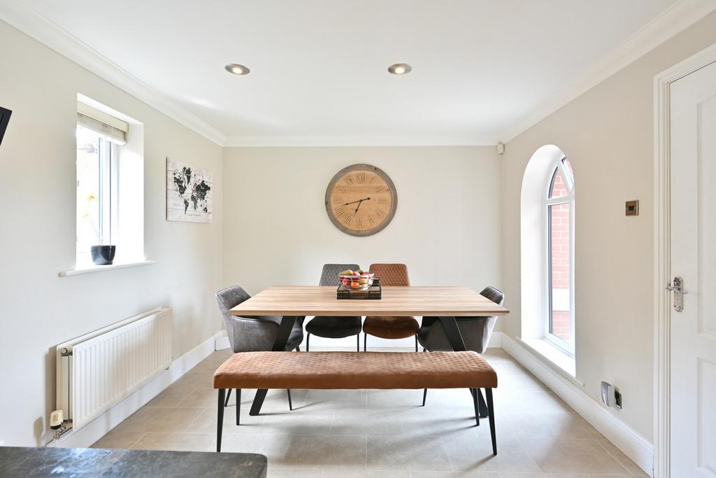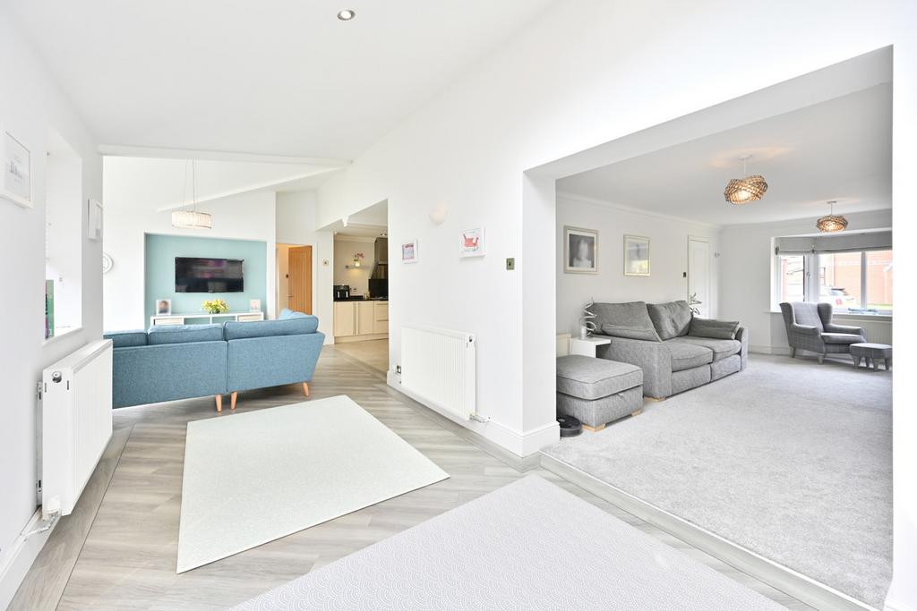 There’s a choice of places to sit. There’s a dining area with a gorgeous arched window and a more relaxed seating area in the family room, which has bi-fold doors and a vaulted ceiling. If you have younger children there’s even room for a play area nearer the lounge.