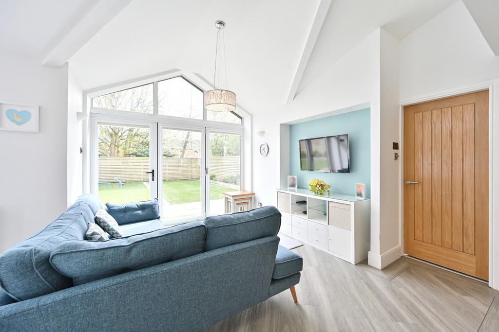 2 x UPVC double patio doors / bi-foldable doors with integral blinds, vaulted ceiling with UPVC window to side, painted ceiling with spotlights, skylight, hanging acrylic light fitting, grey Amtico wood-effect flooring, media alcove with spotlights, 4 x wall uplighters, 2 x double radiators, stainless steel light switches and sockets.