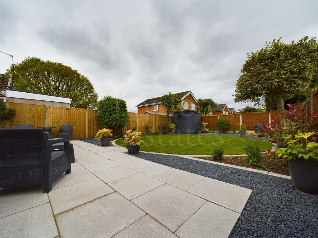 A landscaped fully enclosed rear garden, with shaped planted beds with mature planting. The garden appears to enjoy a sunny aspect. Wooden shed and paved patios, with space for tubs, planters and al fresco dining. Pedestrian door into the rear of the garage.