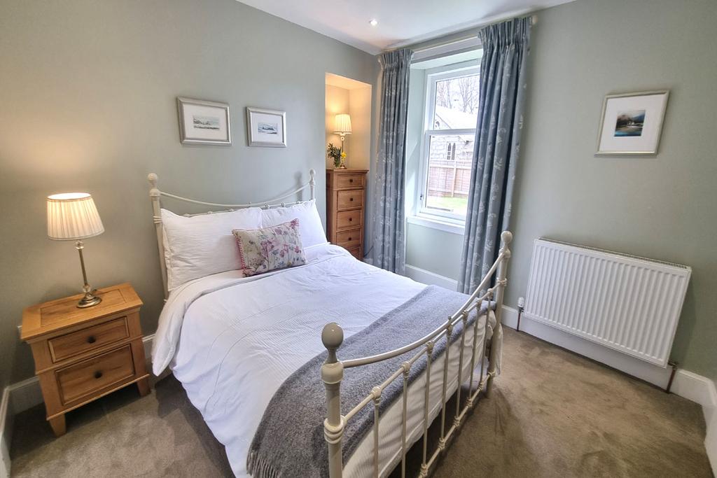 Twin room with windows to the side, giving views to the distant hills. Space for bedroom furniture. Ceiling coving. Pendant light. Radiator. Smoke alarm. Fitted carpet.