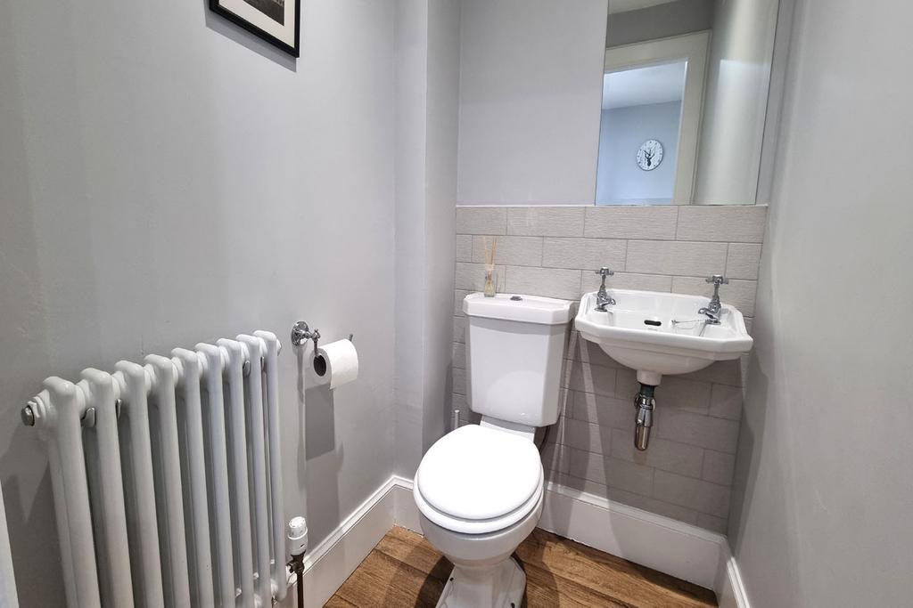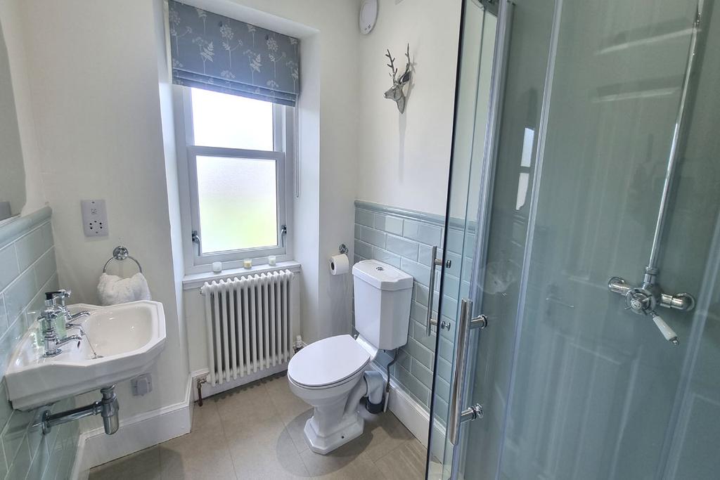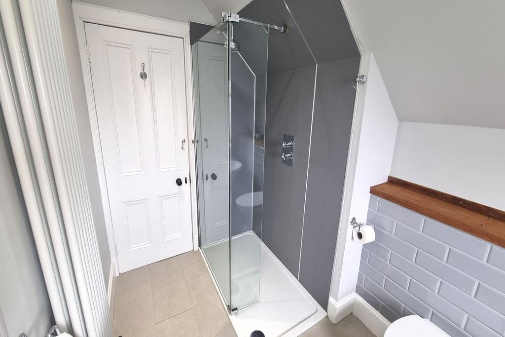 Newly fitted three piece “Heritage” bathroom suite comprising of a WC, pedestal wash hand basin and a walk-in shower with glazed screen. Tiled to dado height. Shaver point. Wall mirror. Toilet accessories. Radiator. Tiled effect laminate flooring. Opaque window.
