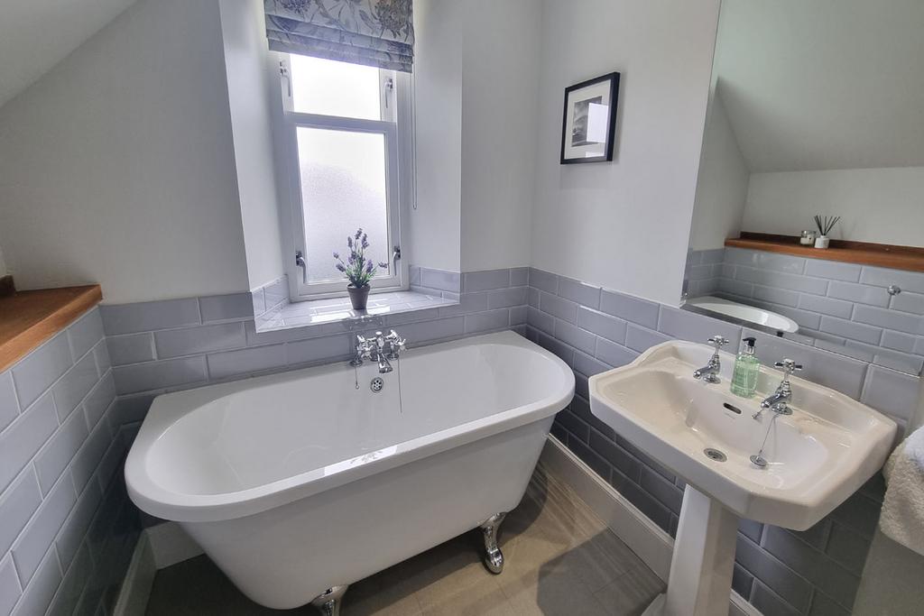 Spectacular four piece “Heritage” bathroom suite comprising of a WC, pedestal wash hand basin, walk-in shower with glazed screen and freestanding bath. Tiled to dado height. Toilet accessories. Vertical radiator. Tiled effect vinyl flooring Recessed lighting. Opaque window to the rear.