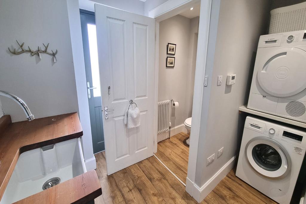 Accessed via a glazed security door from the garden or from the inner hall, this offers great space for boots and coats. Vanity type unit with Belfast sink and oak worktop. Space for washing machine and tumble dryer. Central heating control panel. Recessed lighting. Oak style vinyl flooring. Door to WC.