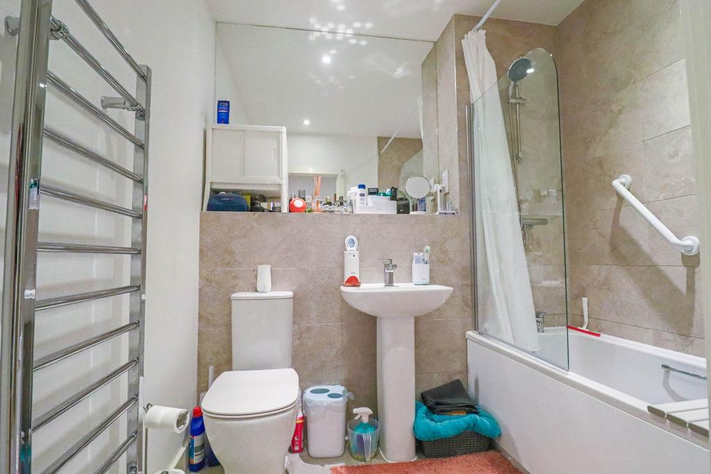 Smooth ceiling with inset spot lights. Comprising panel bath with shower over and glass screen, pedestal wash hand basin and low level WC. Part tiled. Heated towel rail. Extractor.