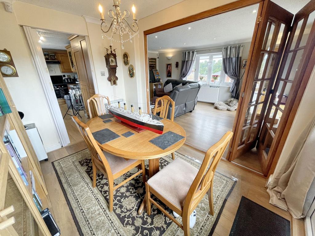Bi folding doors into the dining room from the living room, with patio doors into the garden area and door into the kitchen. Gas centrally heated radiator.