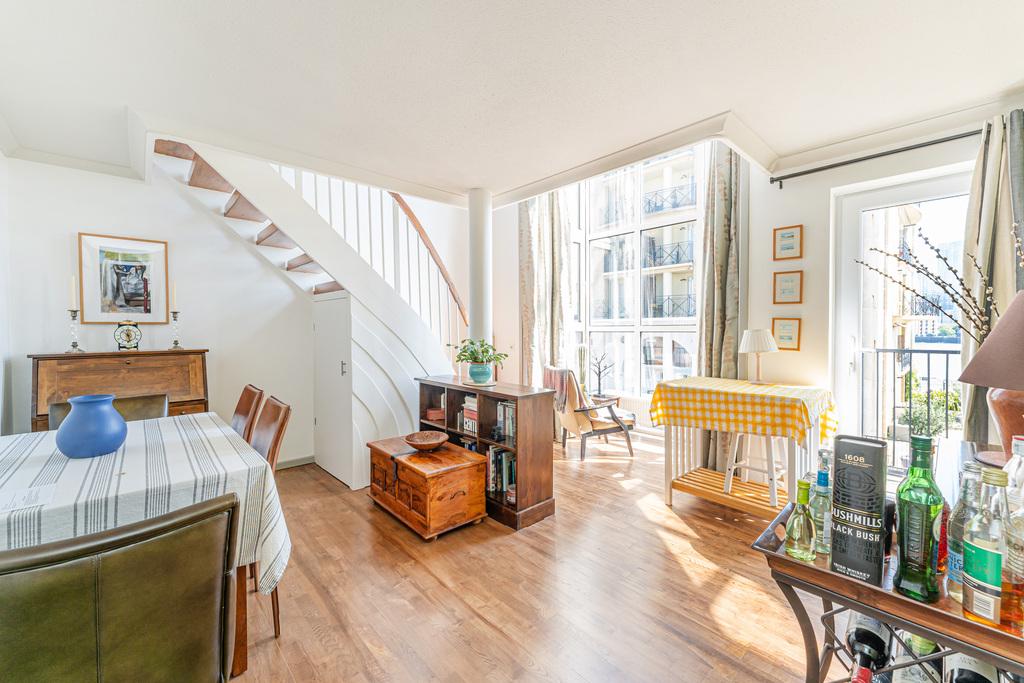 This rare to-the-market three-bedroom duplex apartment is in the iconic Queen of Denmark Court development, Surrey Quays SE16. This stunning property boasts exceptionally spacious living space and breathtaking views over the River Thames and Canary Wharf. The property comprises a separate fitted kitchen, a large dining room with double-height ceilings, a large private balcony, three double bedrooms and two modern family bathrooms. The apartment further benefits from an additional living room on the first-floor mezzanine and ample storage. There is a communal roof terrace and a secure underground car park. Developers meticulously designed every aspect of the property to offer the best and most comfortable living. This incredible development is also well known for its outstanding internal components and the peacefulness of the landscaped communal garden. We highly recommend this property!