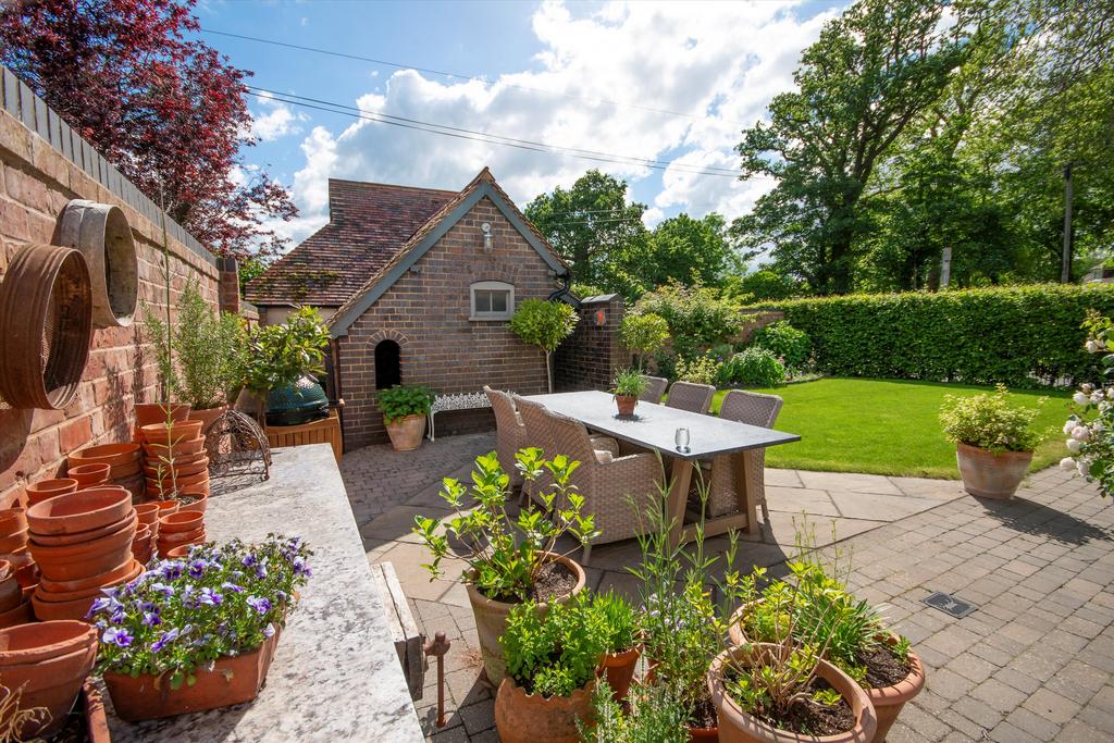 A path runs down the garden between the kitchen terrace past a greenhouse to the double garage and workshop. There is off road parking in front of the garage for 2 cars and an electric car charging point.