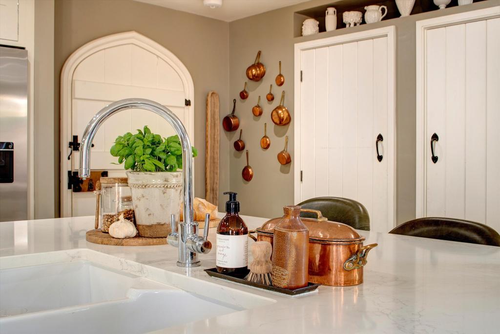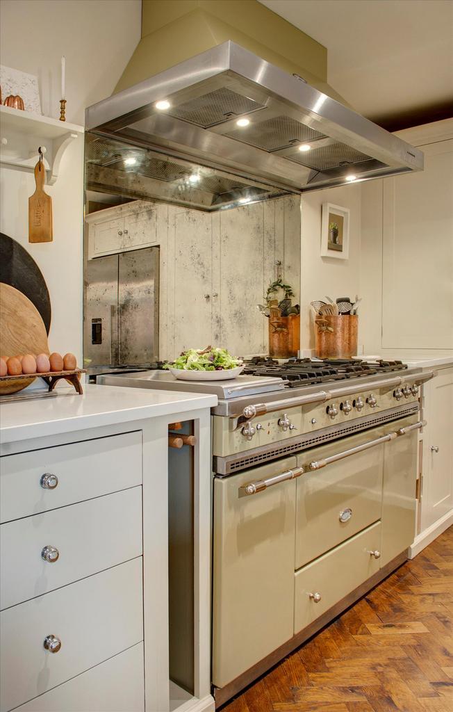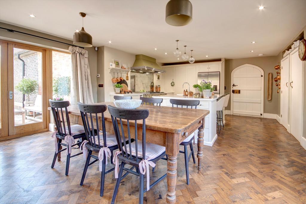 Classic parquet flooring runs through from the hallway into the kitchen (Neptune kitchen and utility) where two sets of French doors on either side of the house lead out onto garden terraces. The kitchen revolves around a large central island and there is a separate utility room and pantry.