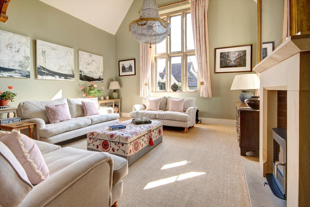 The main drawing room focuses on a stone fireplace fitted with a wood burner and is fully vaulted to the eaves with a gallery above. The room enjoys the benefit of the huge south facing window that floods it with natural light. A secret door leads to a study and there is also a formal dining room.