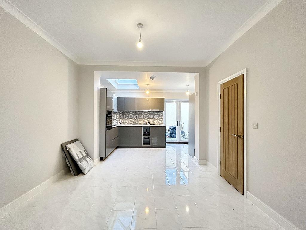 Extended to the rear fitted with a range of grey gloss wall and base units, complementing work surfaces, one and a half sink and drainer unit, electric hob, mid level oven, plumbing for a washer tiled splash backs, tiled flooring, double glazed sky light, double glazed patio doors tot he rear and a radiator.
