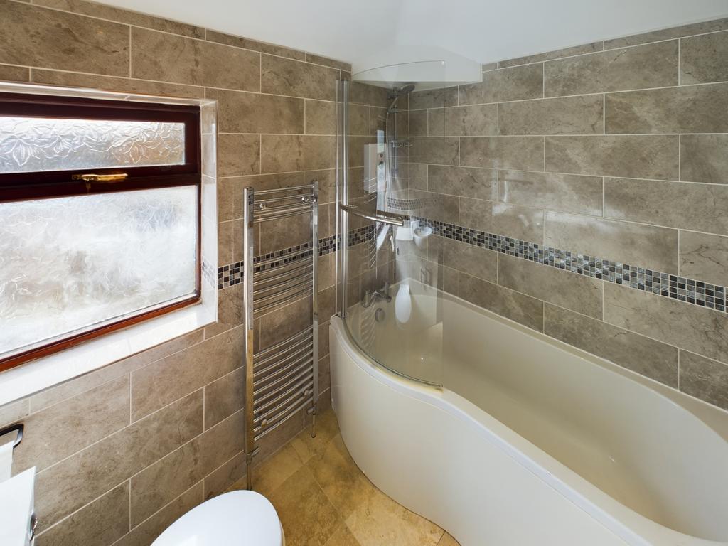 P shaped bath with shower screen, vanity unit with built in close coupled WC. Heated towel rail, window to side, fully tiled walls, tiled floor and ceiling spot lights.