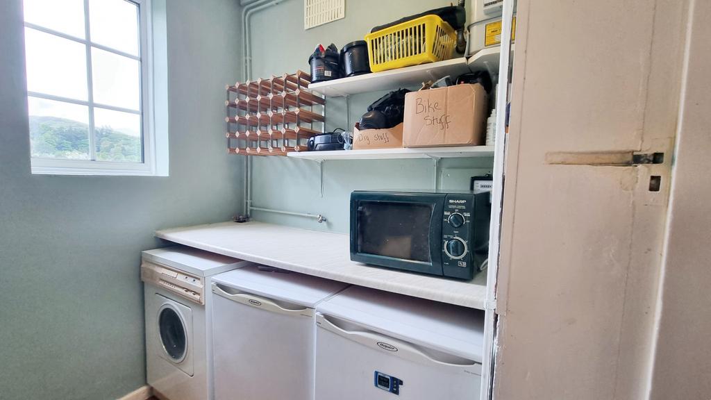 UTILITY with quarry tiled floor, laminate worktop with spaces below Including plumbing for washing machine. Wall shelving, power points and window.