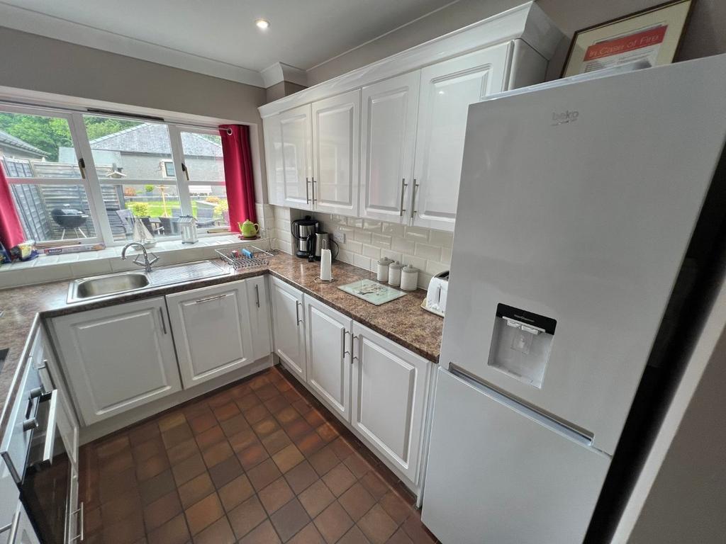 9' 7" x 7' 9" (2.92m x 2.36m) A modern kitchen with a range of base and wall cupboard units with Formica working surfaces above, stainless steel single drainer sink unit with mixer taps, integrated appliances including electric oven with Beko ceramic induction hobs over with stainless steel cooker hood, integrated dishwasher, partly tiled walls.