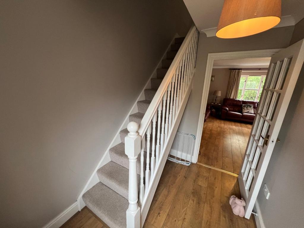 With laminate flooring, understairs storage space.