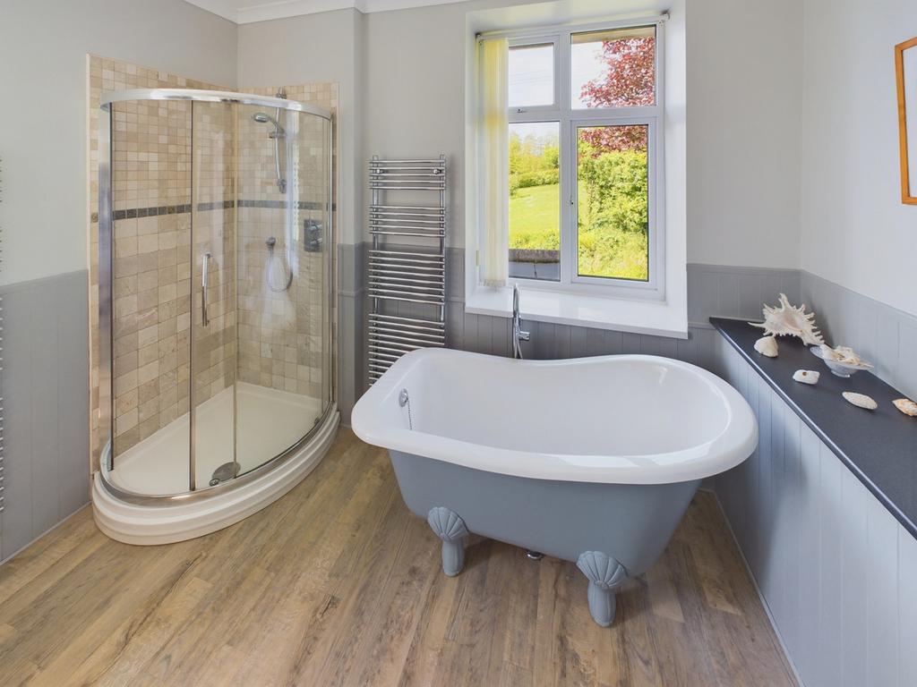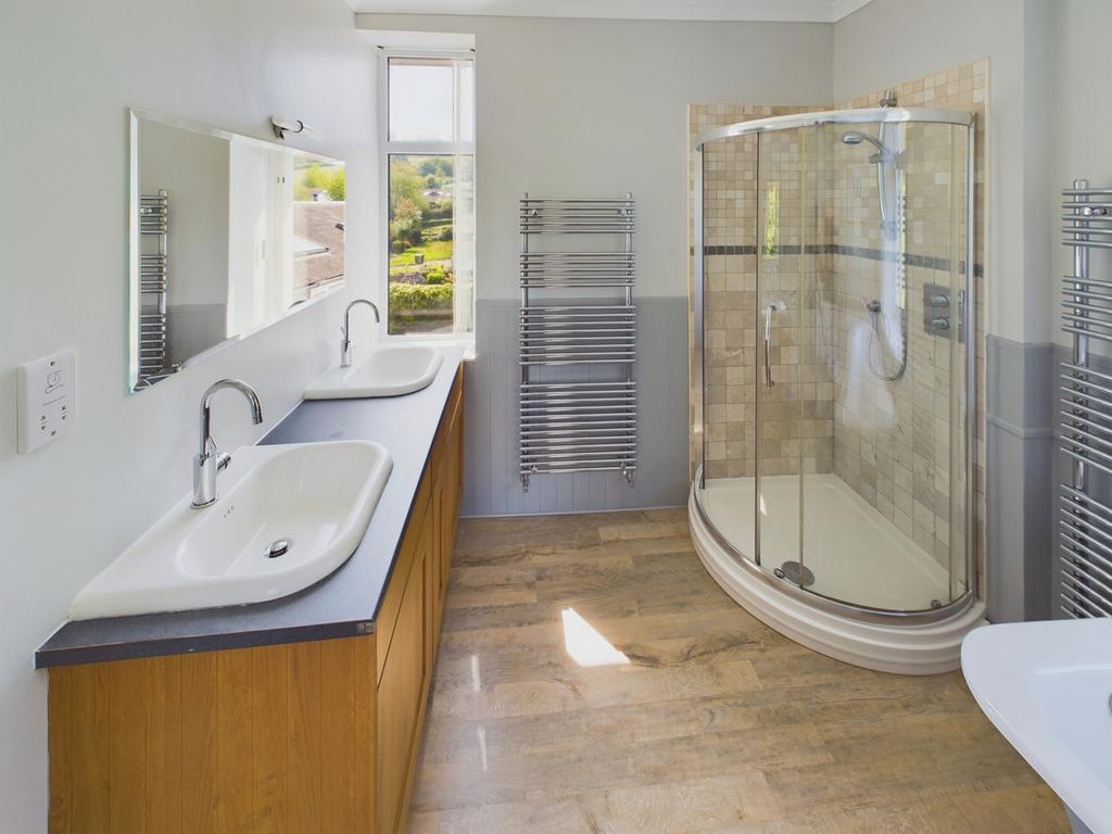Each bedroom in the main house is a generous double bedroom, each enjoying spectacular countryside views. The principal bedroom enjoys a stylish en suite bathroom designed for ultimate relaxation. It comprises a corner shower, WC, double washbasins, and a freestanding slipper bath with a delightful outlook across the lawned garden. A smartly appointed shower room with a double-width shower cubicle, a wash basin and WC is conveniently located at the end of the hallway to serve the other bedrooms.