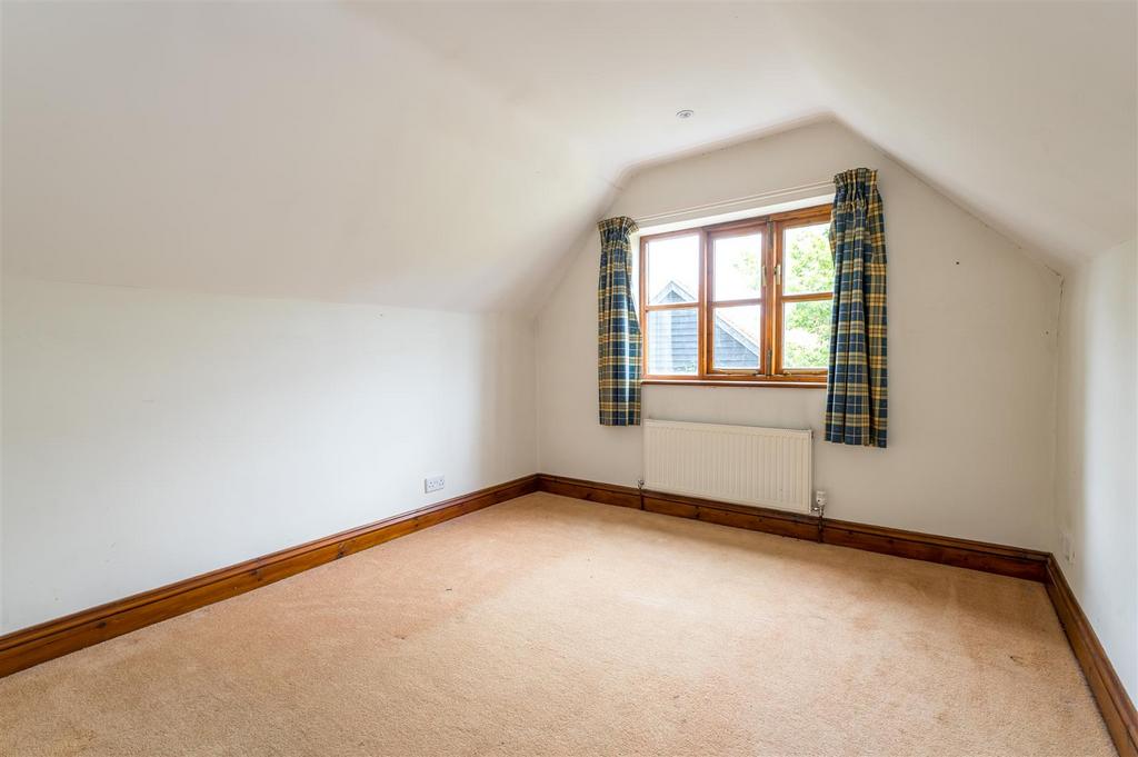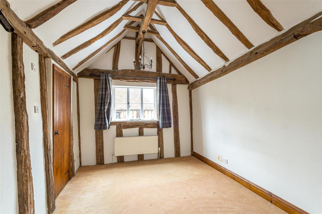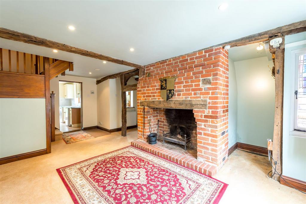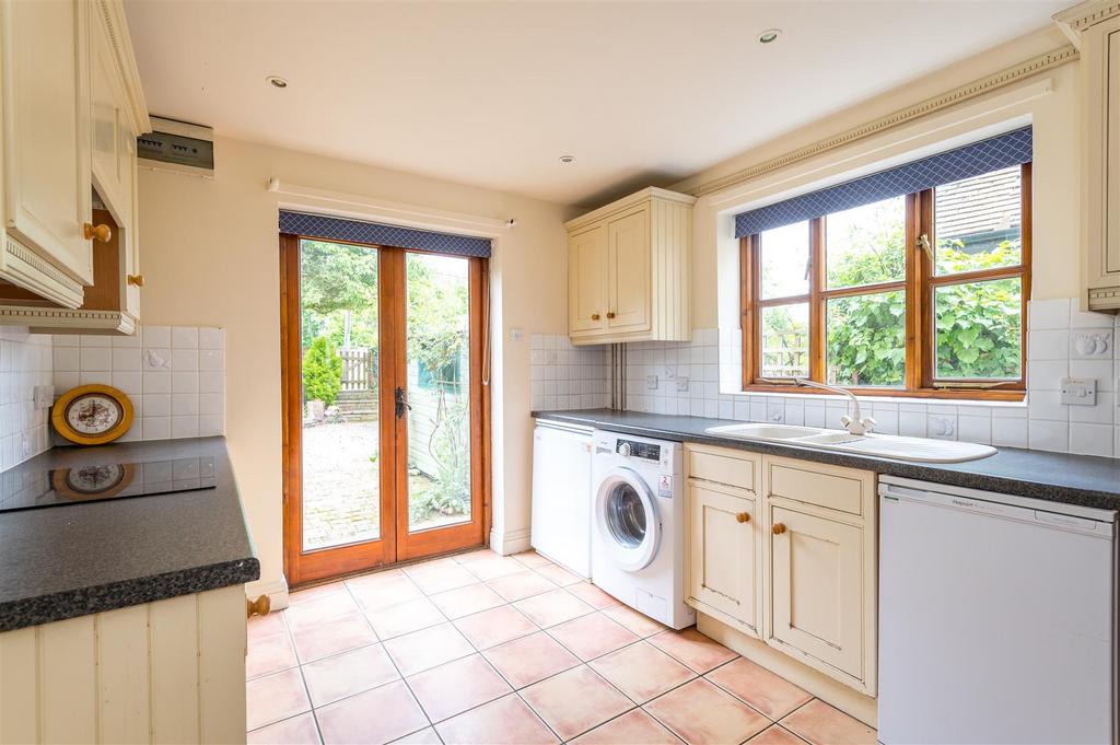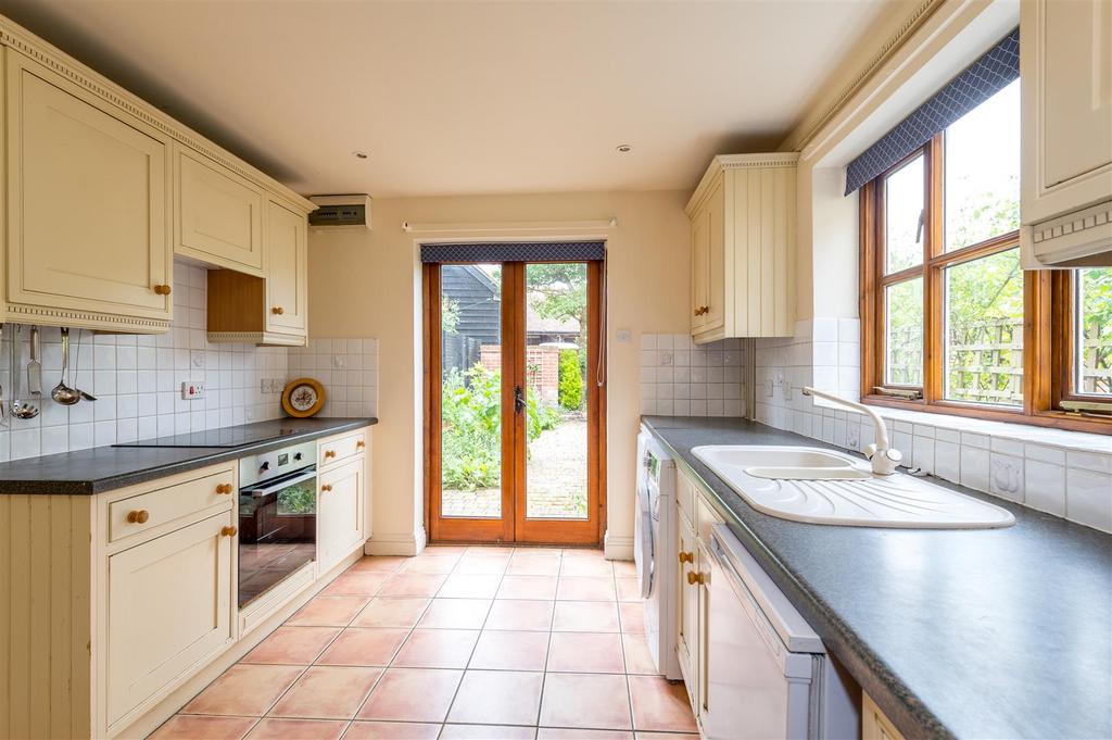 The sitting room features an oak bressummer and herringbone brick hearth fireplace with an additional study area. The kitchen is fitted with worksurfaces, numerous base and eye level units, inset cooker and hob, fridge, and plumbing for a washing machine. To the rear of the kitchen, double doors open out onto a pleasant rear garden.