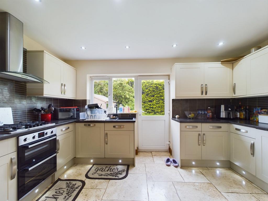 The kitchen has been fitted with a range of wall and base mounted cupboards with a granite effect worksurface and LED kick board lighting. A window and door overlook and lead to the rear garden. The five ring gas job with extractor sited above, electric oven and grill, dishwasher and resin sink with drainer are all integrated.