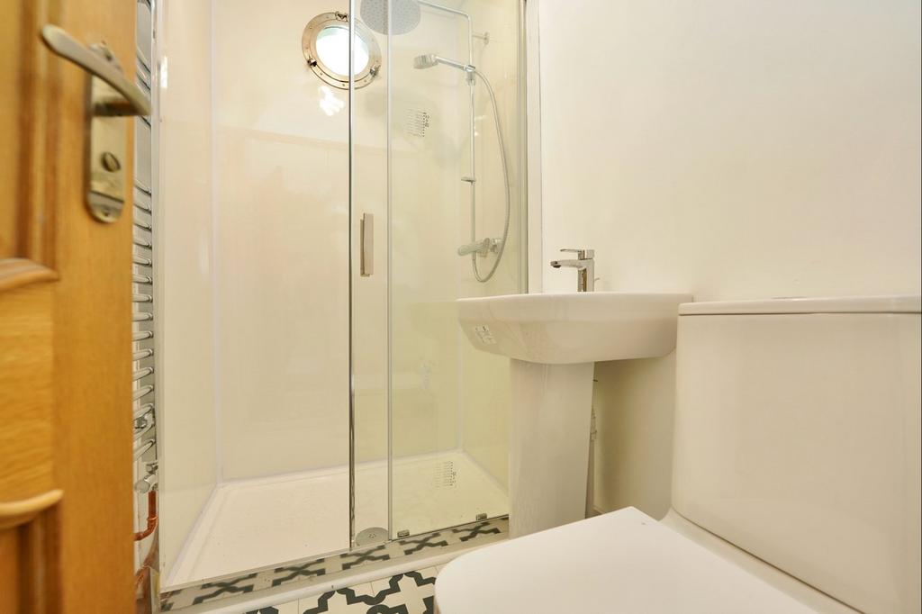 Circular porthole feature window, fitted in a three piece suite comprising low level WC, wash hand basin, double shower cubicle with drench style shower head and hand held attachment, aqua-boarding, heated towel rail, shaver point.