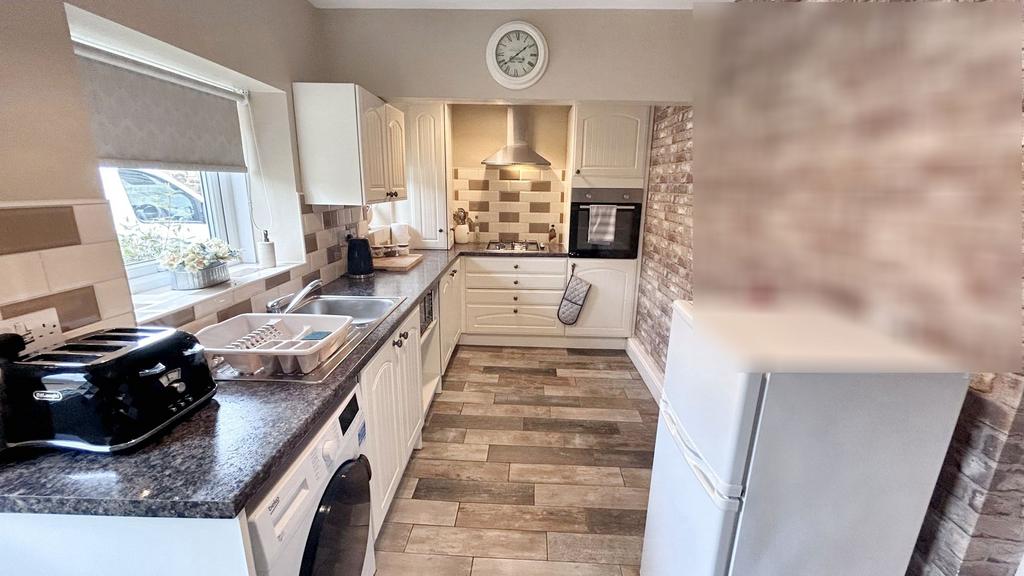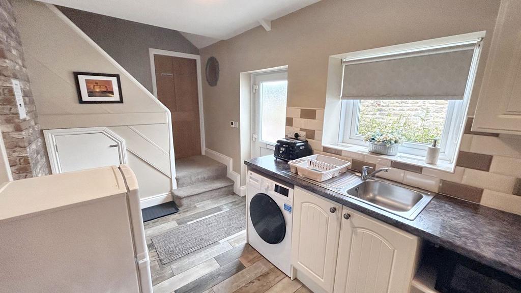 Two windows to rear with fitted blinds and access door to rear. A fitted shaker style kitchen with a range of cream wall, floor and drawer units with contrasting roll edge worktops and tiled splashbacks, integrated gas hob with brushed steel chimney extractor over, separate integrated electric oven, stainless steel sink and drainer with mixer tap, plumbing for washing machine, space for fridge freezer, porcelain wood effect floor tiles with underfloor heating, stairs to first floor with understair storage cupboard.