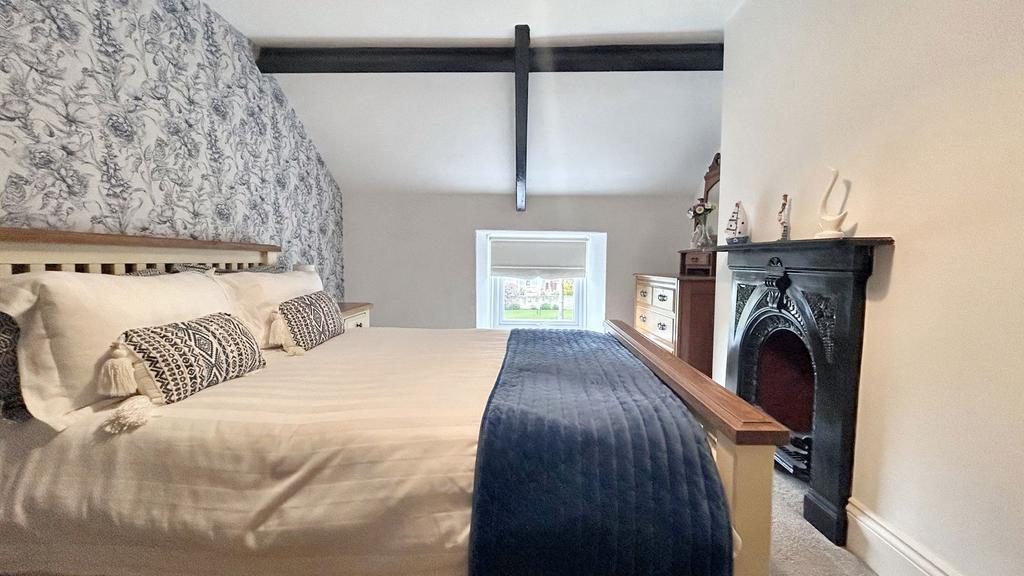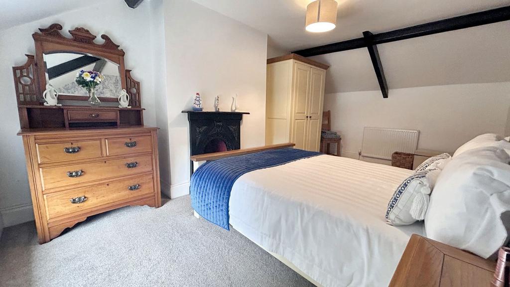 Two windows to front with fitted blinds, original cast iron fireplace, original beams to ceiling.