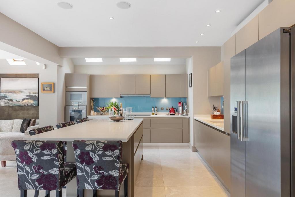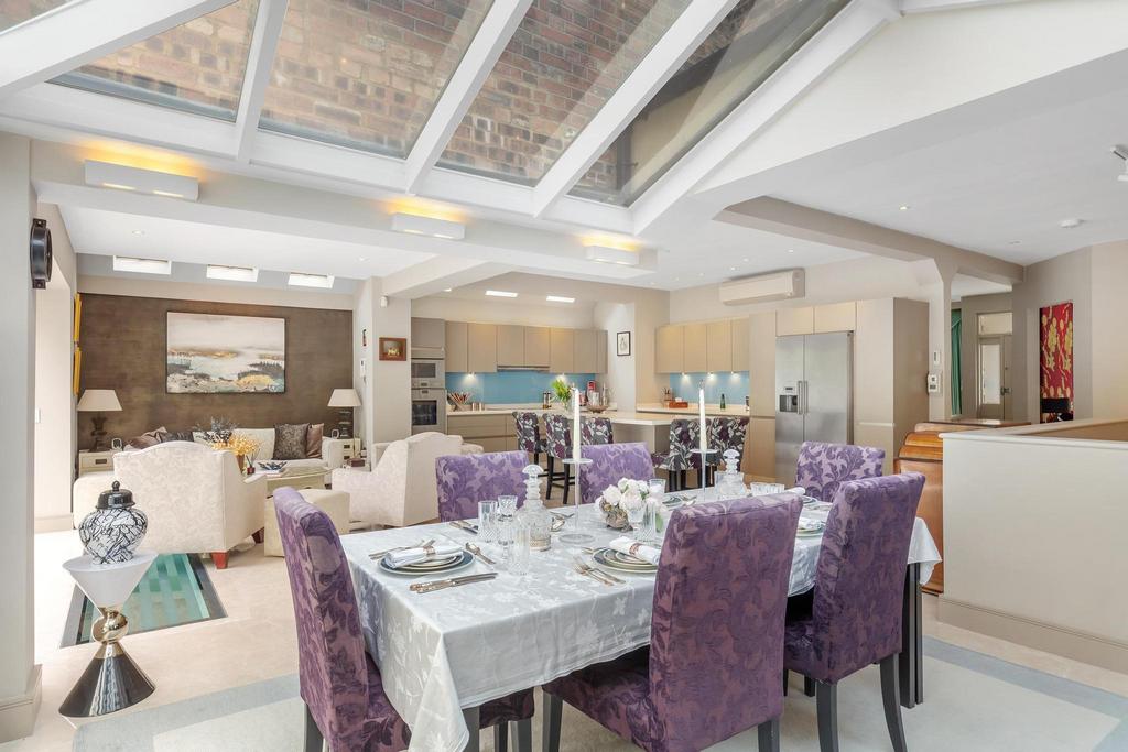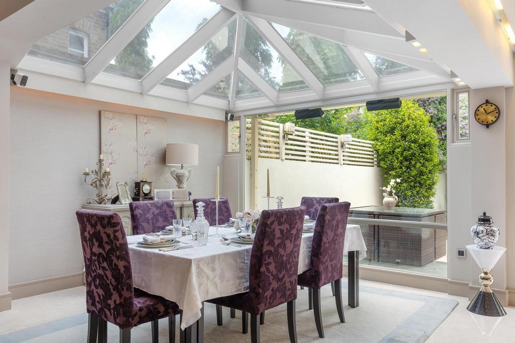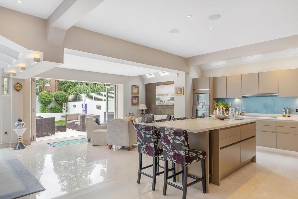 This impeccably refurbished and elegantly extended property offers beautifully proportioned accommodation across four floors. The ground floor features a grand entrance hall with bespoke wardrobes, a WC, and a sitting room adorned with a feature fireplace and bay window. At the rear, a stunning open-plan kitchen/dining/reception area awaits, showcasing a custom-designed kitchen with high-end integrated appliances, Italian marble flooring, a picture window, and bi-fold doors leading to a beautifully landscaped garden complete with outdoor speakers and sophisticated lighting.