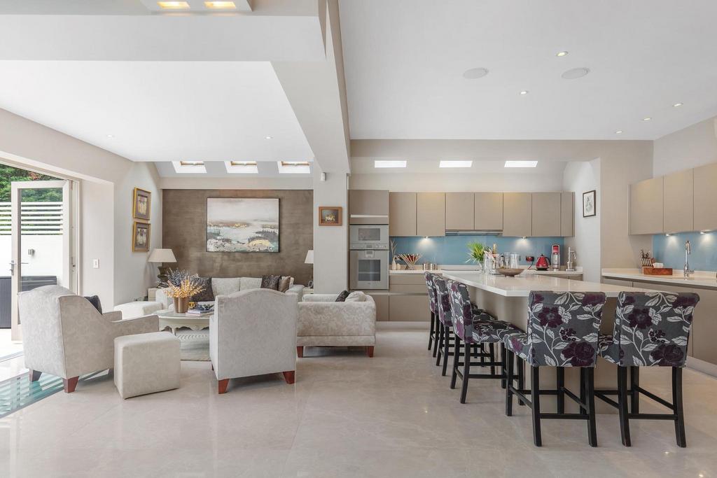 On the first floor, the impressive principal bedroom includes a walk-in dressing room with bespoke Italian cabinetry and a luxuriously appointed en suite bathroom featuring a bath and separate shower. This floor also hosts two additional generous bedrooms and a stylish family bathroom. The top floor houses two further spacious bedrooms, each with its own en suite bathroom.
