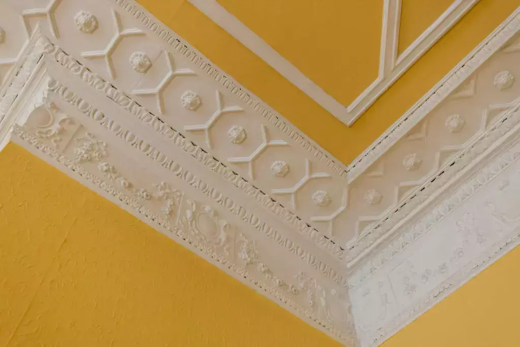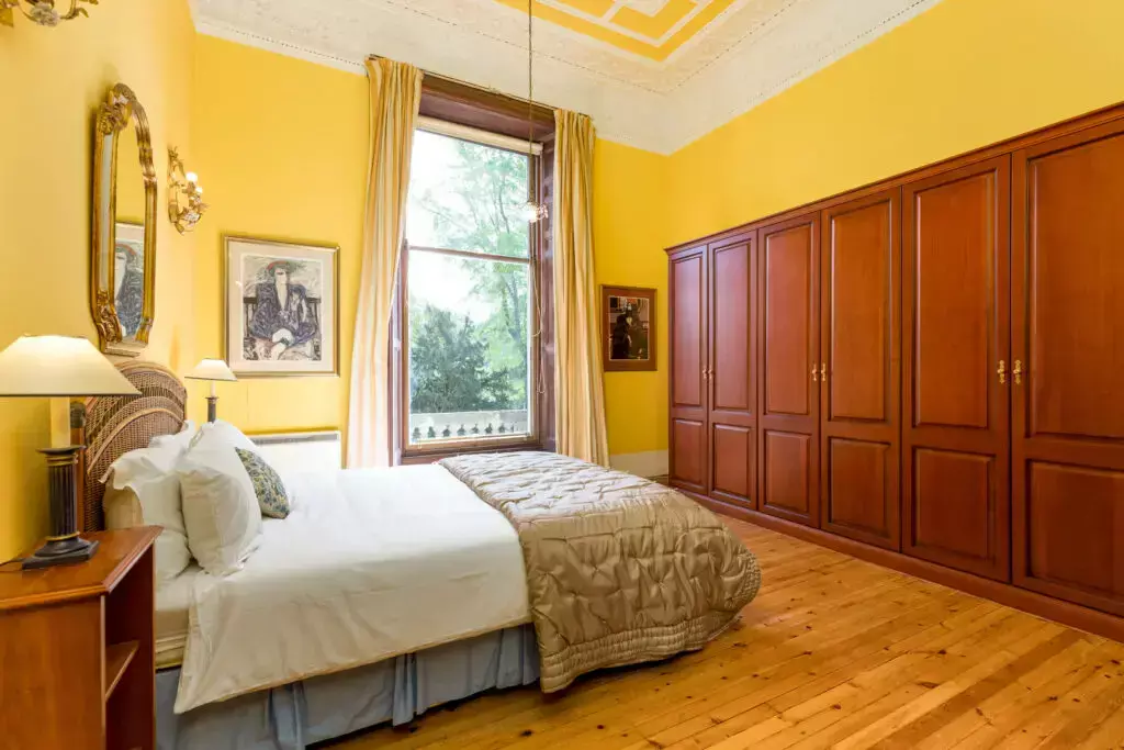 A spacious double bedroom with built-in wooden wardrobes and exquisite, original ceiling plaster design and cornice.