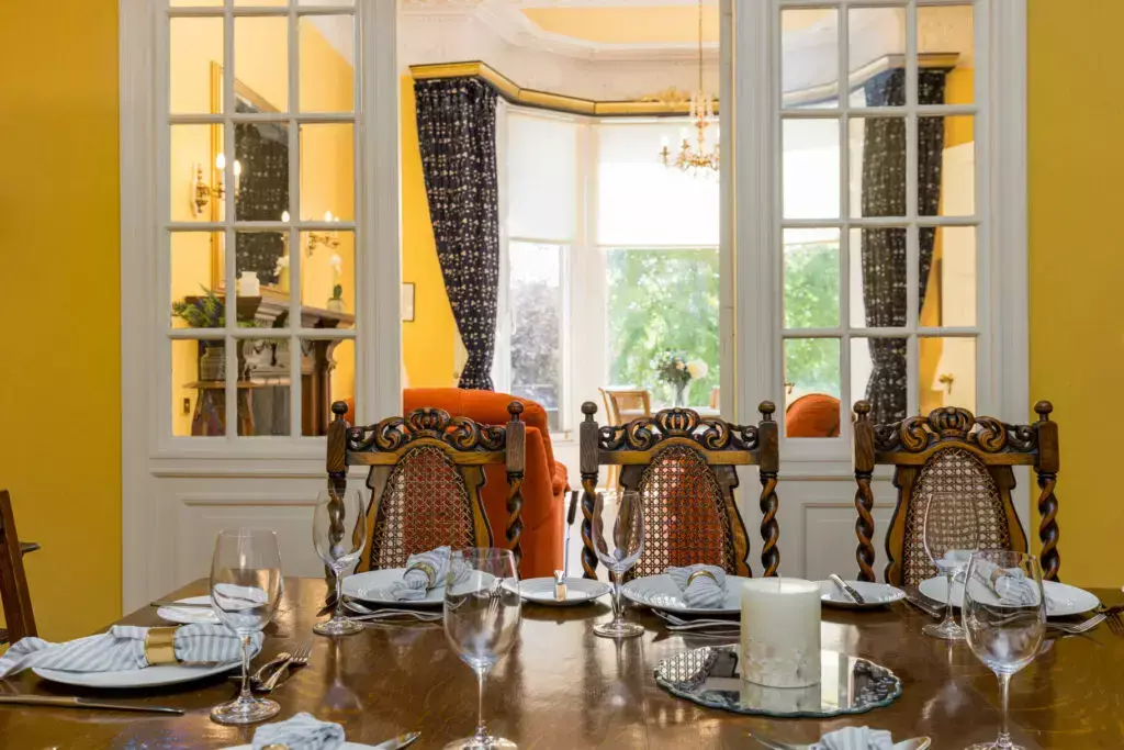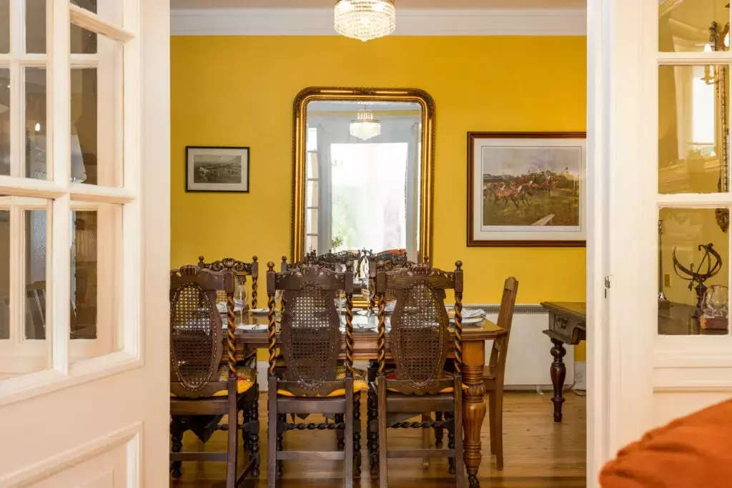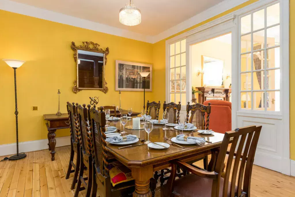 A large dining area off the main entrance hallway and via glazed doors from the drawing room, this is an ideal space for entertaining friends. With two carved timber pillars matching the grand front door, a wow-factor unique to this property.