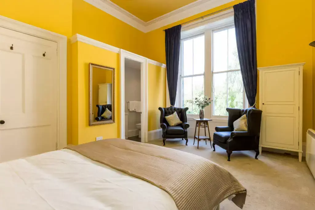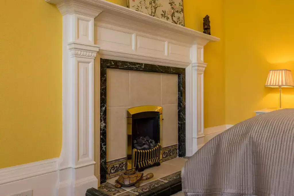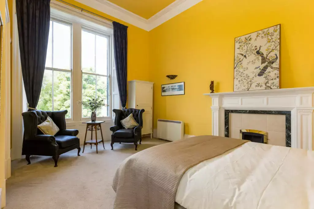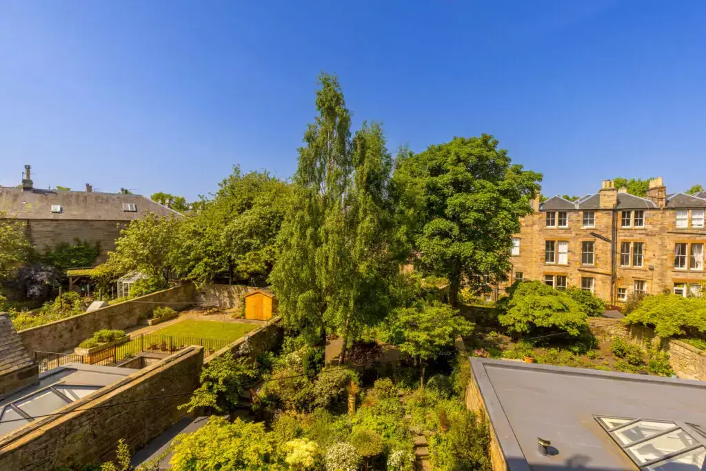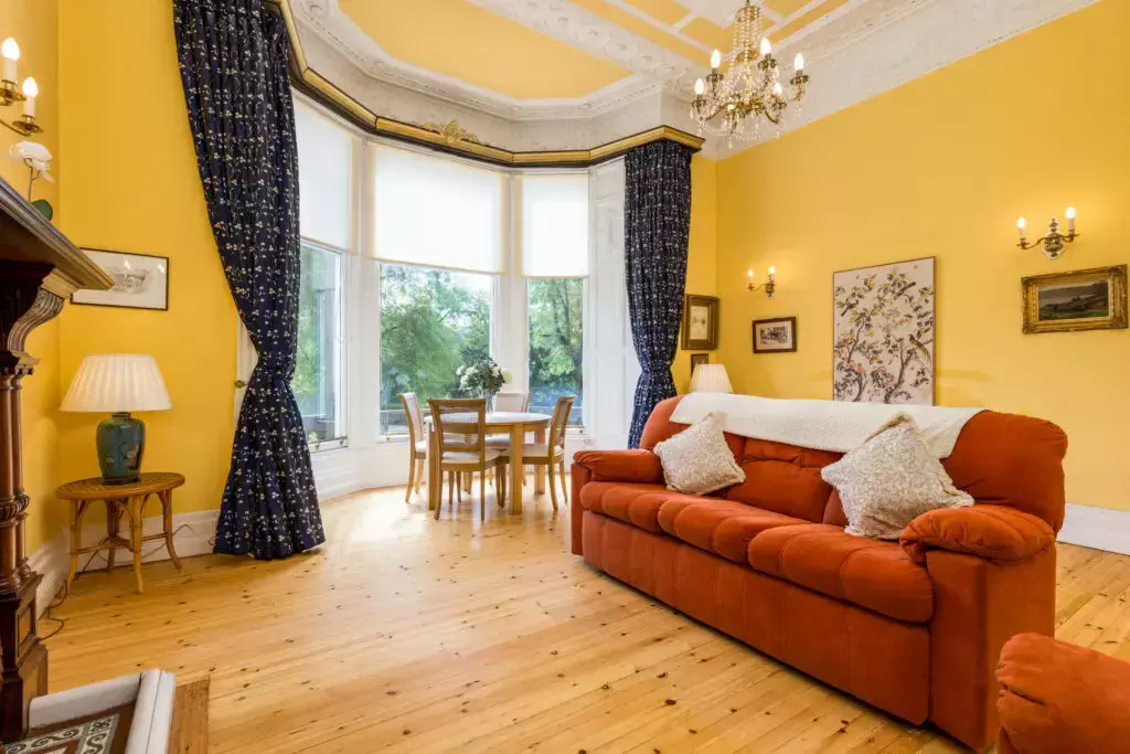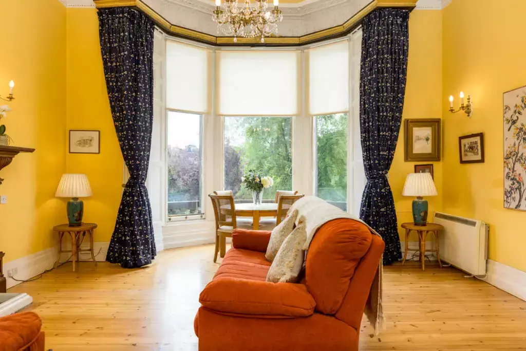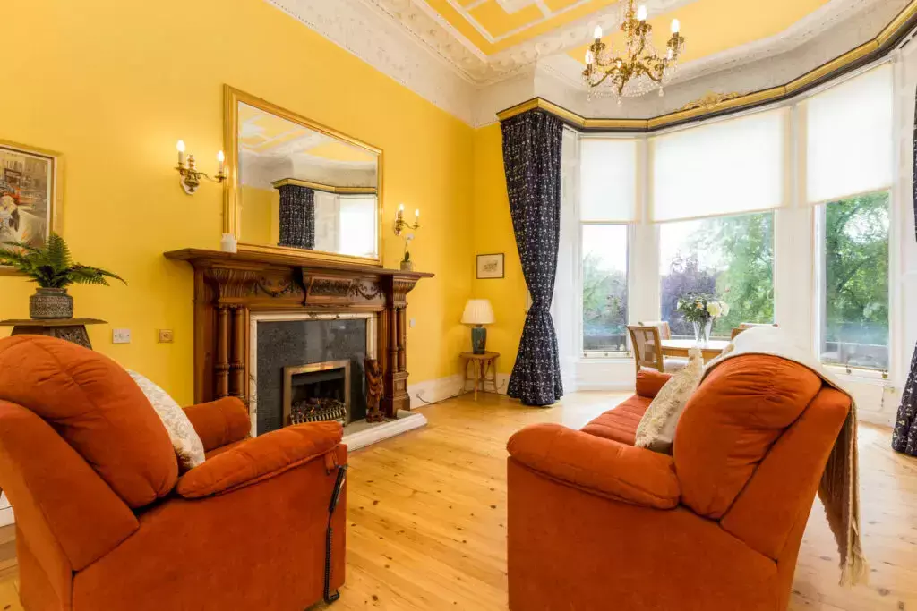 A uniquely bright and spacious drawing room with large original feature fireplace, bowed bay window with stone balustrade. The perfect south-east facing space overlooking manicured gardens and views to St Mary's Cathedral and the Pentland Hills.