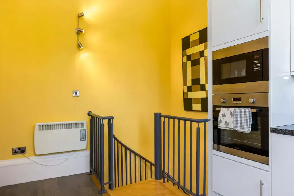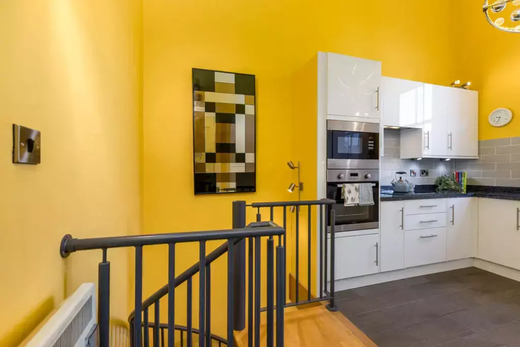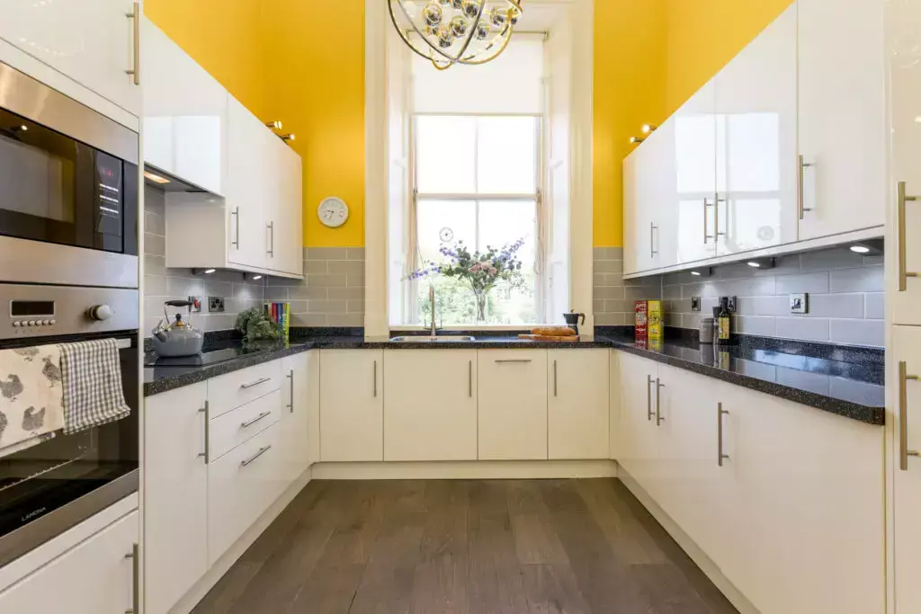 A bright and modern kitchen with large quartz-style work top and plenty of cupboard space and integrated units. Modern lighting provides a stylish contemporary touch to this elegant period property.