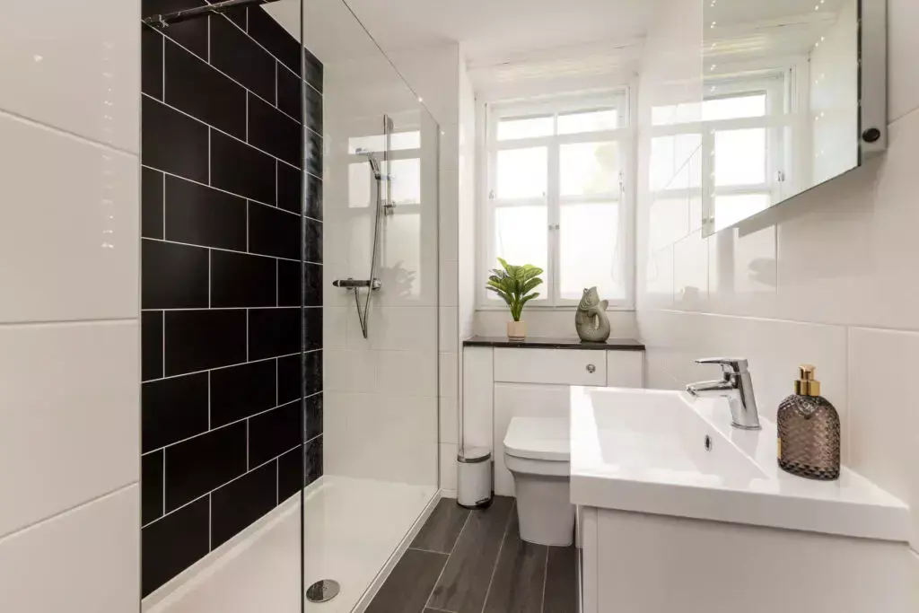 A bright and modern tiled bathroom with three-piece-suite including large walk-in shower.