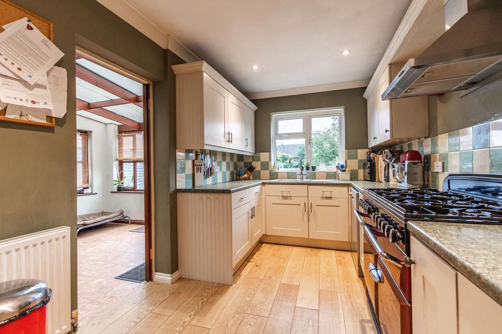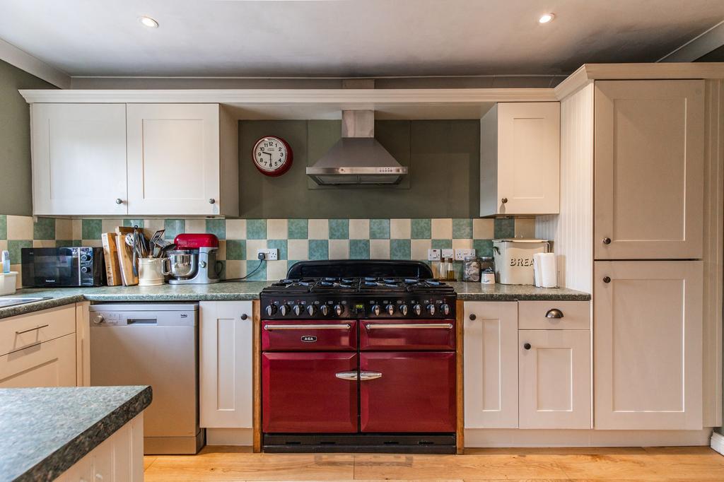 The kitchen, designed in a classic shaker-style, perfectly complements the home's character. It features an Aga gas oven, ideal for those who love to cook.