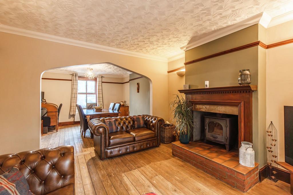 As you enter the property, you are welcomed into a cosy lounge which exudes warmth and character. The lovely focal fireplace, complete with a wood-burning stove, is perfect for cosy evenings, and the original wooden flooring adds a touch of timeless charm.