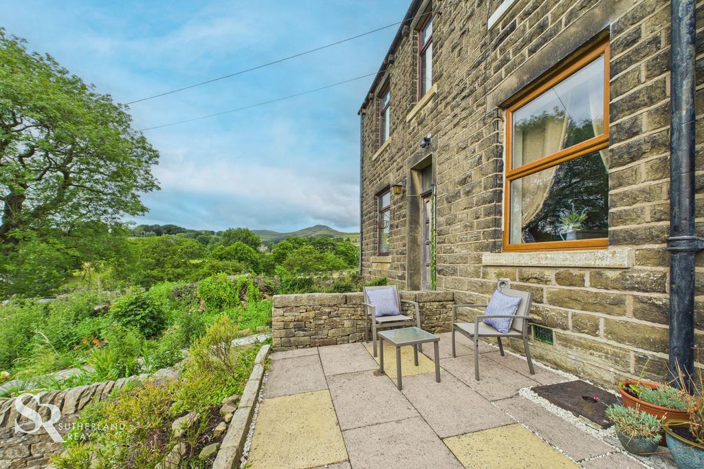 A terraced and lawned rear garden with a stone-paved patio to the back elevation offering beautiful countryside views. It includes a garden shed and a smaller storage area.