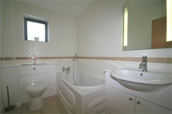 Three piece suite comprising panel bath, low level WC with hidden cistern, wash hand basin with built-under vanity unit. Splash-back wall tiling. Heated towel rail. Aluminium framed double glazed window to side. Extractor fan. Tiled flooring.
