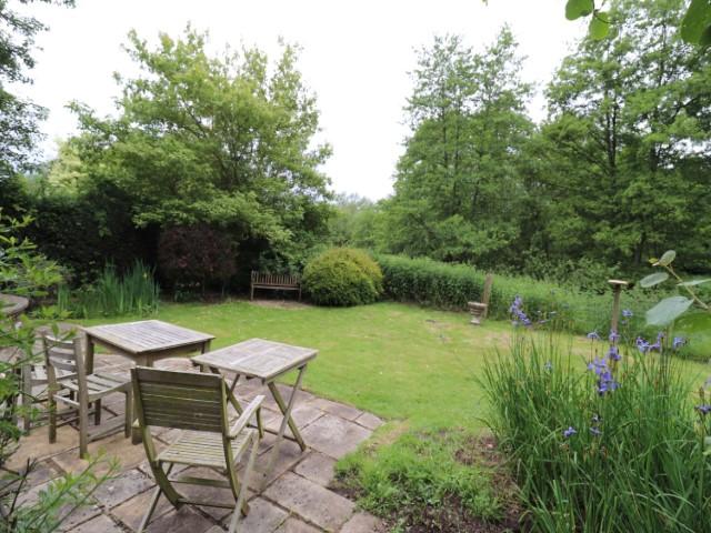 A lawn, with borders and shrubs to the sides, sweeps down to the REAR GARDEN, where there are beds to the north west corner with flowering trees and a RUSTIC TRELLIS ARCH. The patio door at the north end of the Dining Room opens to a small paved area, from which WIDE STEPS, with wrought iron RAILINGS to the side, lead down to a PAVED AREA beneath a TIMBER PERGOLA, covered by a climbing kiwi bush, to the rear of the Dining Room, with a raised brick flower bed under the picture window. The paved area continues to the rear of the house, where there is a shrub bed and a semi-circular ORNAMENTAL POND, to the side of steps leading to a wide PAVED PATIO across the rear of the house, outside the patio doors. Beyond the patio and paved area is a lawn, with various shrubs, and a PAVED SITTING AREA, backed by shrubs and a flowering cherry tree. To the south side is a holly screen hedge. The rear boundary is a low netting fence, with the water meadows and alder trees beyond, leading down to the River Tas.