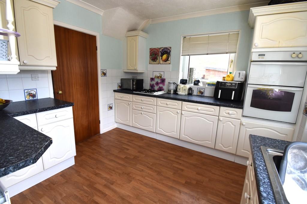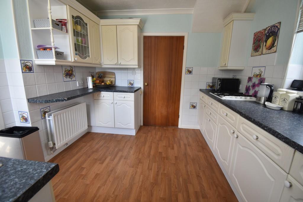 The fitted kitchen features a stainless steel sink and drainer set in a base unit, additional base units with complementary work surfaces, matching eye-level units, an integrated electric oven with gas hob, plumbing for a washing machine, an integrated refrigerator, uPVC double glazed windows to the rear and side elevations, complementary tiling and a door leading to the side passageway. From here a door leads to the dining room which has a uPVC double glazed window to the rear elevation and a central heating radiator.