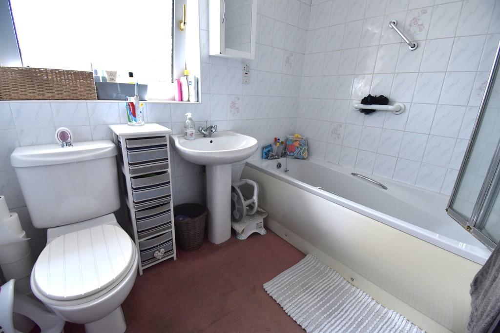 The bathroom has a bath with a wall-mounted electric shower and side screen, a wash hand basin, a low-level WC, complementary tiling, a central heating radiator and a uPVC double glazed window to the rear elevation.