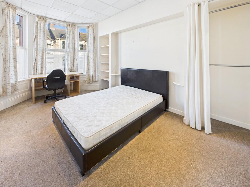 Bedroom is decorated neutrally with furniture including double bed, wardrobe, chest of drawers, bedside tables, desk and chair with a beautiful period bay window, providing ample natural light and space.