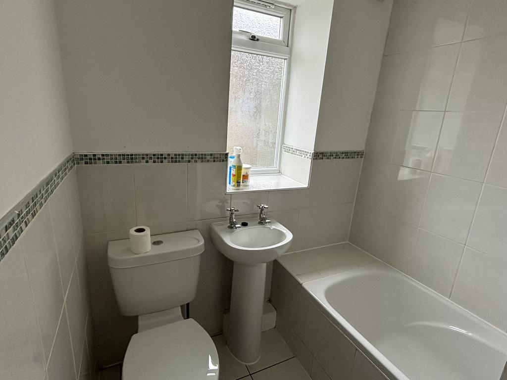 Bathroom 3 piece suite comprising panel bath with shower over, pedestal hand basin and low level WC, double glazed window, central heating radiator and part tiled walls.