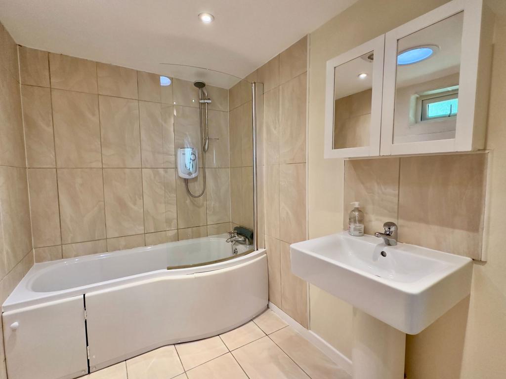 With high level window to rear elevation, 'P' shaped bath with curved shower screen and electric shower, heated towel rail, pedestal wash hand basin, low level WC, natural light from 'sun spot' located in the ceiling, inset spotlights, extractor fan.