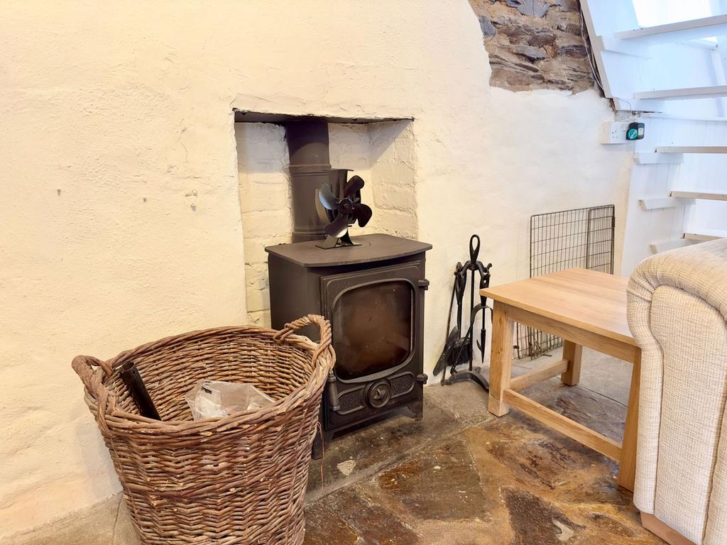 Dual aspect room with uPVC double glazed window and further window to side elevation and uPVC window to rear. Fireplace with inset wood burning stove, TV point, beamed ceiling, stone paved floor, two central heating radiators, door to: