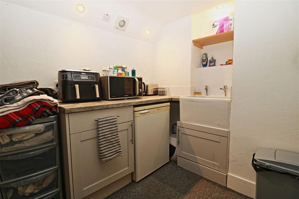 Part-glazed timber door and two double glazed windows. Kitchenette area at one end with some floor units, worktop and a Belfast sink. Access to...